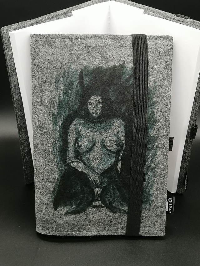 Cuaderno extraíble con 100 hojas blancas cosidas de 14 x 21 cm • Funda de fieltro reciclado (RPET) de 30 x 22 cm (extendida) • 2 gomas elásticas: una para mantenerlo cerrado y otra para sujetar el bolígrafo o lápiz.