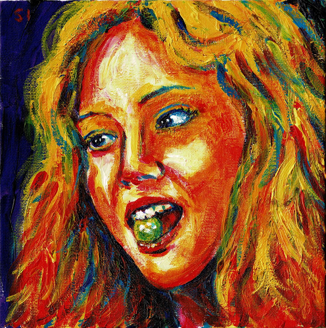 Agnes queda suspendida en el instante previo al mordisco, donde placer y amenaza se funden. Los naranjas y amarillos incendian el rostro y liberan una energía febril que desborda el marco. En ese filo inestable, la pintura atrapa un juego de deseo y poder que nunca se entrega del todo.