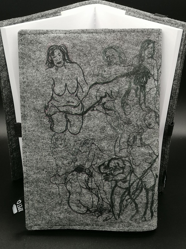 Cuaderno extraíble con 100 hojas blancas cosidas de 14 x 21 cm • Funda de fieltro reciclado (RPET) de 30 x 22 cm (extendida) • 2 gomas elásticas: una para mantenerlo cerrado y otra para sujetar el bolígrafo o lápiz.
