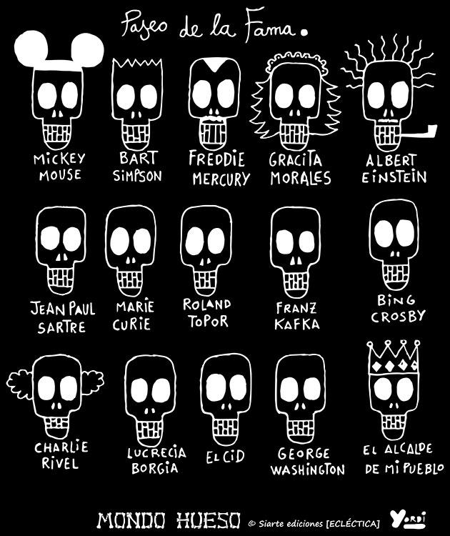 • Una camiseta de manga corta, escote redondo, ribeteado y pronunciado. Costuras laterales y corte ajustado para lucir el paseo de la fama calavérico mas molón del mundo.