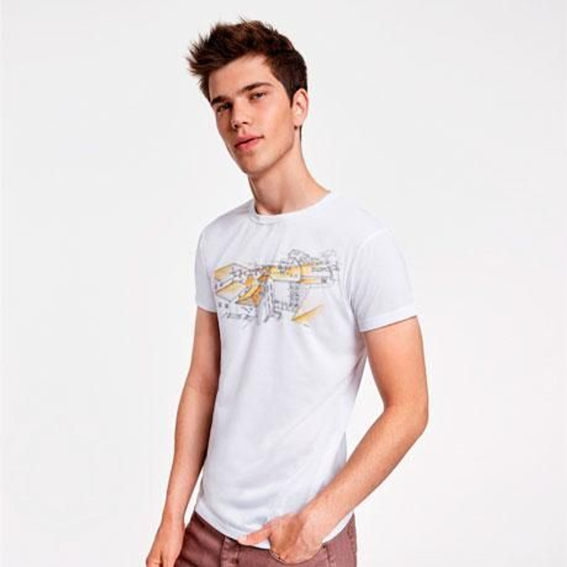 • Camiseta de manga corta con cuello redondo viveado en el mismo tejido y costuras laterales que sirve de perfecto lienzo para un dibujo urbano con el toque justo de color.